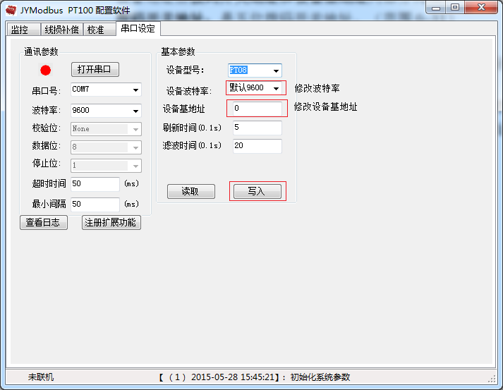 打开采集配置软件,选择串口设定菜单,在通讯参数中点击关闭串口,选择相应的串口号和波特率(默认9600),超时时间最小间隔都改成50ms?;静问?strong>设备型号选择PT08。点击打开串口 ,点击 读取 按钮,在下边信息栏中显示读取成功,则表示联机成功,(若显示通信失败,请确定串口接线,串口号,波特率和地址是否正确)。