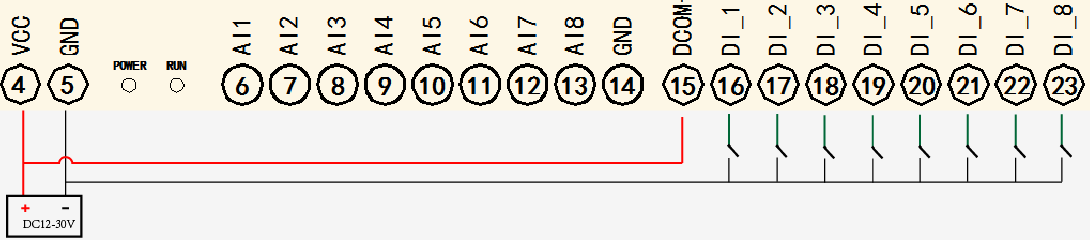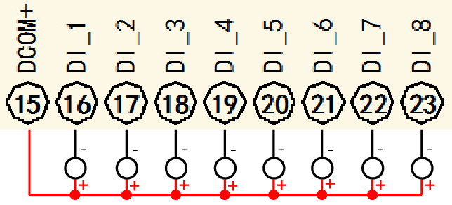 DI(开关量输入) | 15 | DCOM+ | 开关量输入信号正(共正,电压范围DC5-30V) |