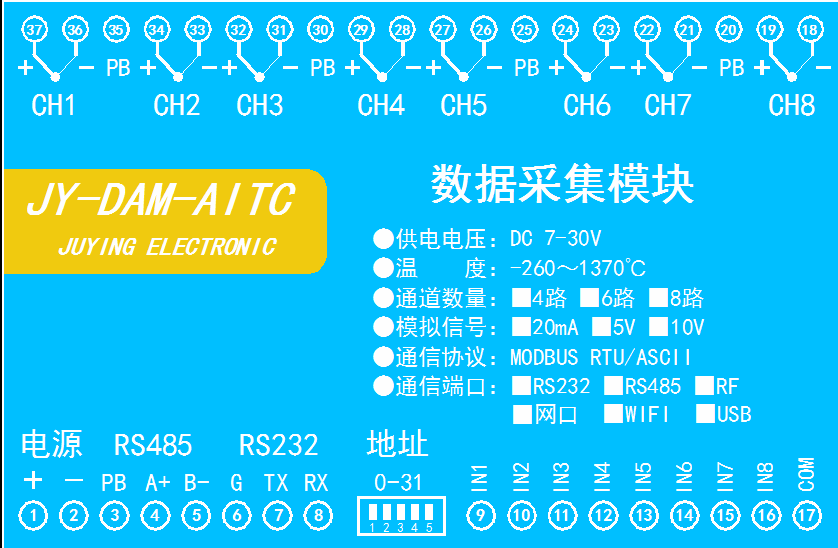 联网方式:RS232/RS485 功能说明:8AI+8TC 版本说明:标准版 协议:Modbus TCP/RTU/ASCII 软件说明:免费测试/应用软件 二次开发:支持 安装方式:35mm导轨或四角螺丝