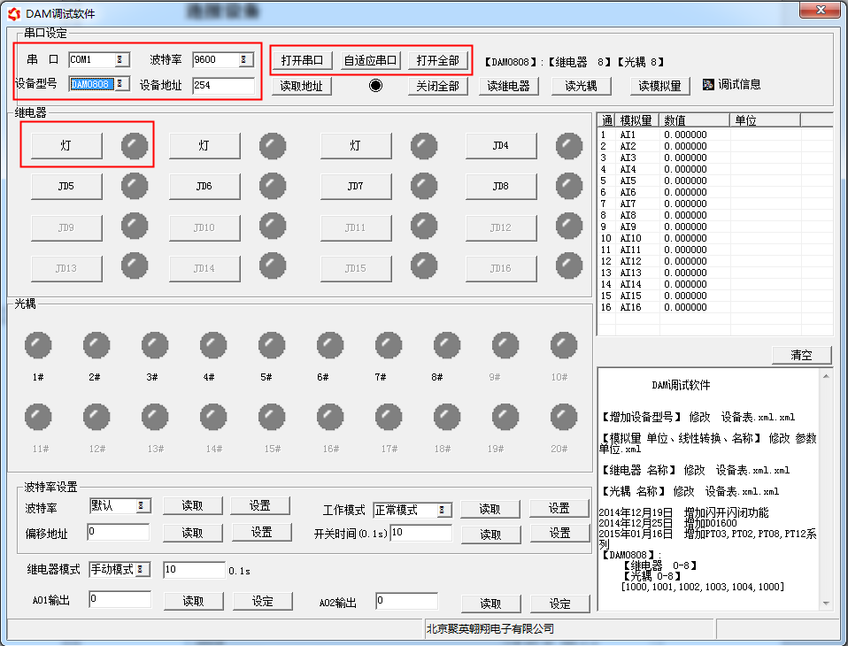 打开“聚英翱翔DAM调试软件”;串口设定栏:串口选择您电脑对应COM口,波特率选择设备默认波特率(9600)(未自己设置过波特率前),设备地址填写“254”(254为设备的广播地址),设备型号选择相对应型号,设置好以上设备的4个参数后点击打开串口,点击继电器按钮“JD1”若继电器反应则连接成功。