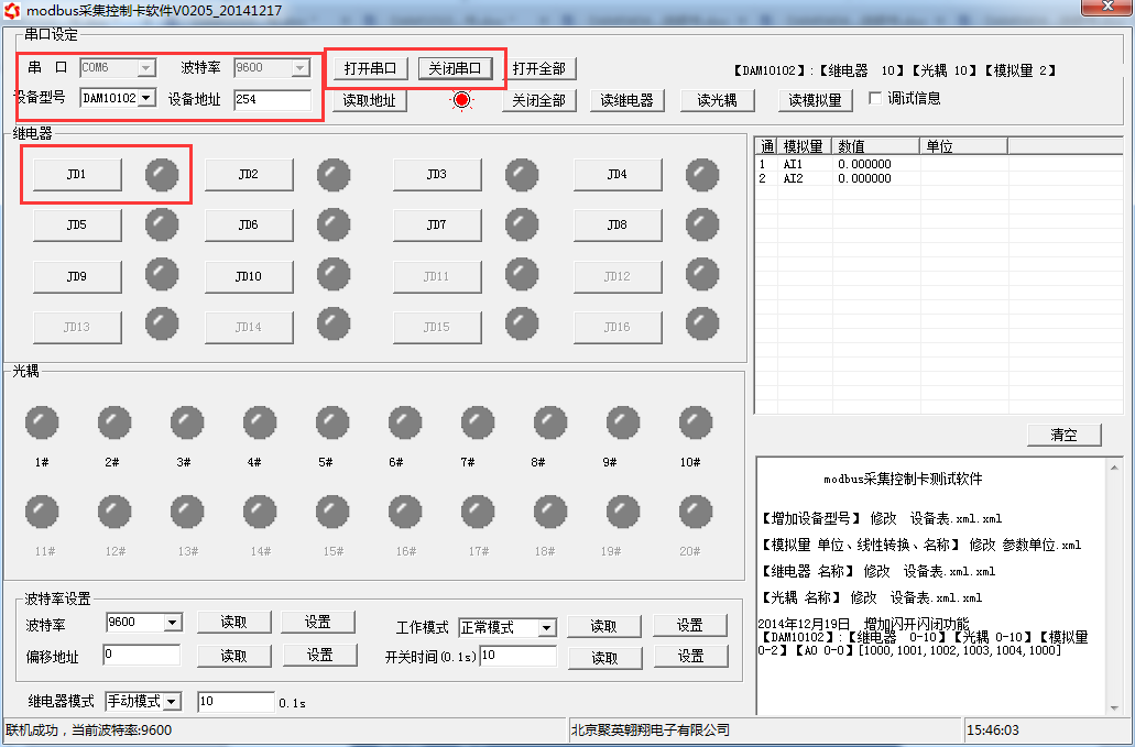 打开“聚英翱翔DAM调试软件”;串口设定栏:串口选择您电脑对应COM口,波特率选择设备默认波特率(9600)(未自己设置过波特率前),设备地址填写“254”(254为设备的广播地址),设备型号选择相对应型号,设置好以上设备的4个参数后点击打开串口,点击继电器按钮“JD1”若继电器反应则连接成功。