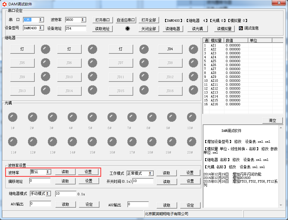 打开“聚英翱翔DAM调试软件”;串口设定栏:串口选择您电脑对应COM口,波特率选择设备默认波特率(9600)(未自己设置过波特率前),设备地址填写“254”(254为设备的广播地址),设备型号选择相对应型号,设置好以上设备的4个参数后点击打开串口,点击继电器按钮“JD1”若继电器反应则连接成功。