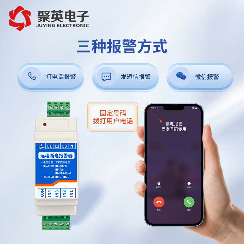 远程断电报警器用于实现对鱼塘养殖、畜禽养殖场、水 族馆、供电柜等场合断电时进行远程报警。设备采用220/380供电,内置4G网络无需用户插卡,远程报警方式包 含APP消息、微信通知、电话、短信报警等四种方式,其中APP消息、微信通知永久免费,电话和短信报警为收费功能, 电话报警0.2元/次,短信报警0.1元/次,报警费用由用户通过 微信小程序自主充值。报警功能由用户自主选择是否启用。