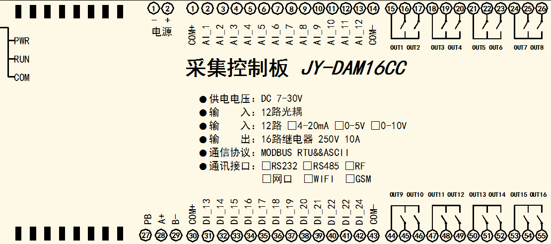 型号 | modbus | RS232 | RS485 | USB | WiFi | 输出 | AD | 光耦 |
