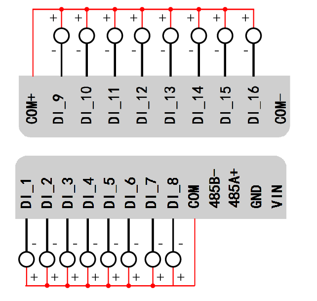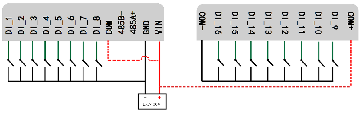 • 16路光耦隔离输入(5-24V),可以接无源触点和DC3.3-24V电压。