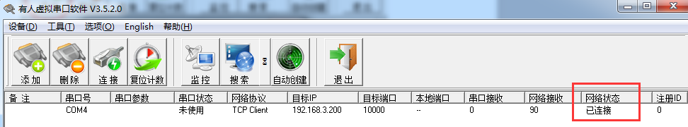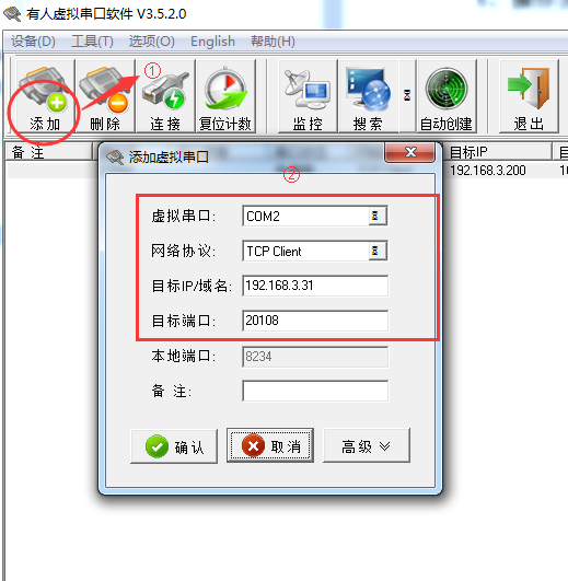 注:添加的虚拟串口不能与本机已有的串口冲突,目标IP即设备的IP,虚拟串口参数要求与章节4中配置的设备参数一致。