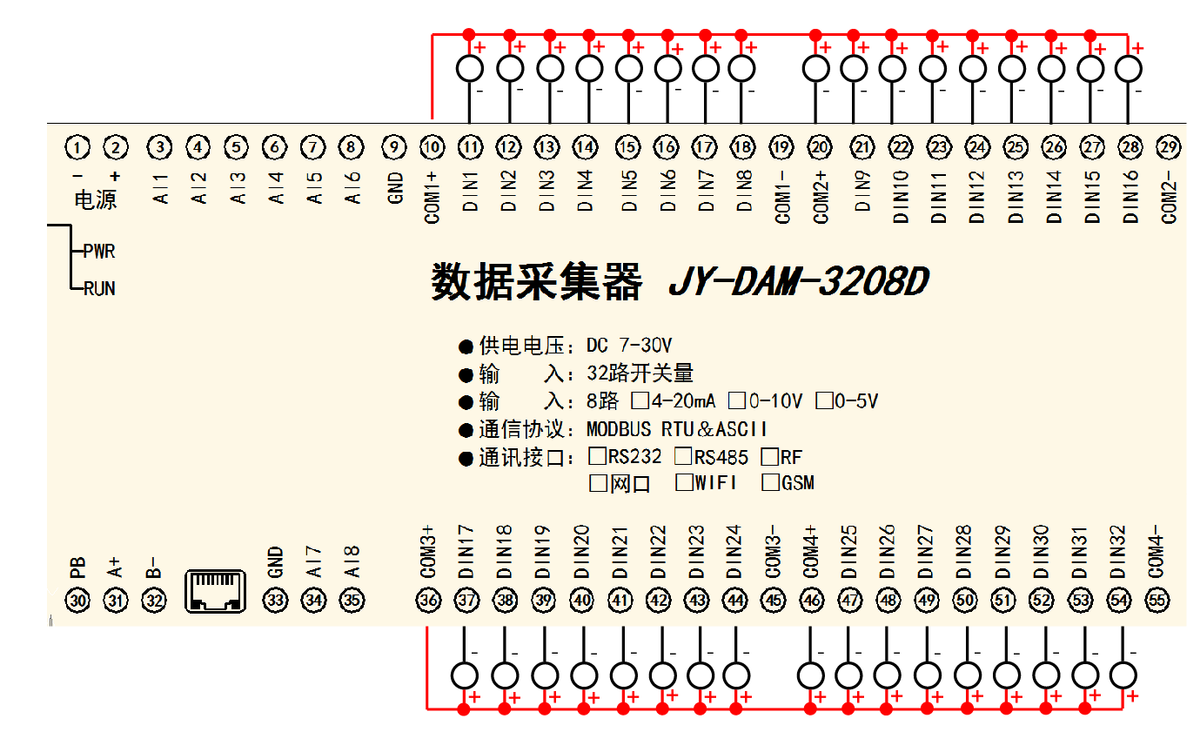 • 32路光耦隔离输入,可以接无源触点和DC5-24V电压