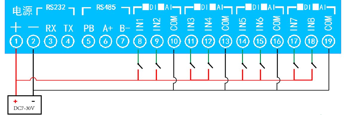 1、有源开关量(PNP型高电平)接线示意图
