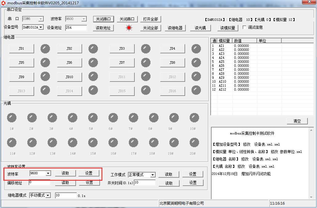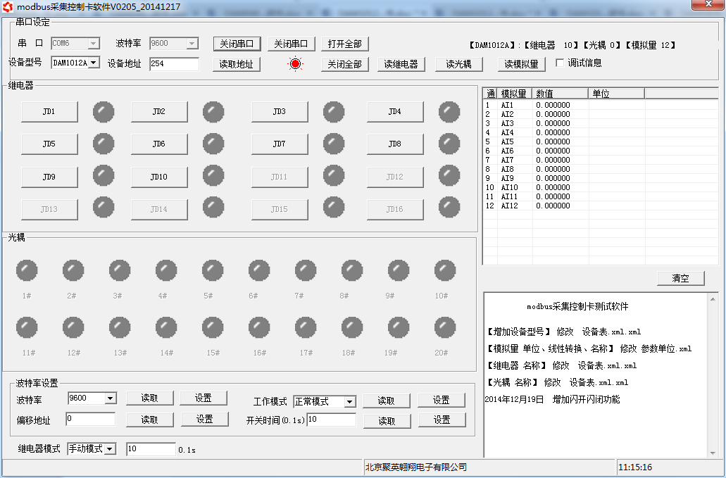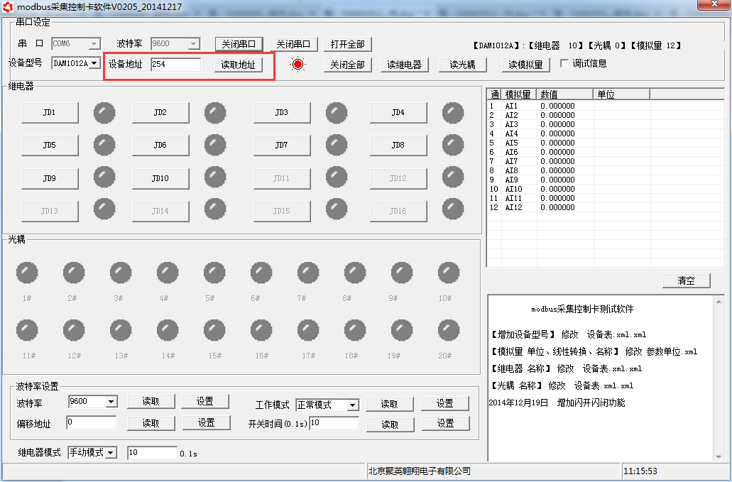 打开“聚英翱翔DAM调试软件”;串口设定栏:串口选择您电脑对应COM口,波特率选择设备默认波特率(9600)(未自己设置过波特率前),设备地址填写“254”(254为设备的广播地址),设备型号选择相对应型号,设置好以上设备的4个参数后点击打开串口,点击继电器按钮“JD1”若继电器反应则连接成功。