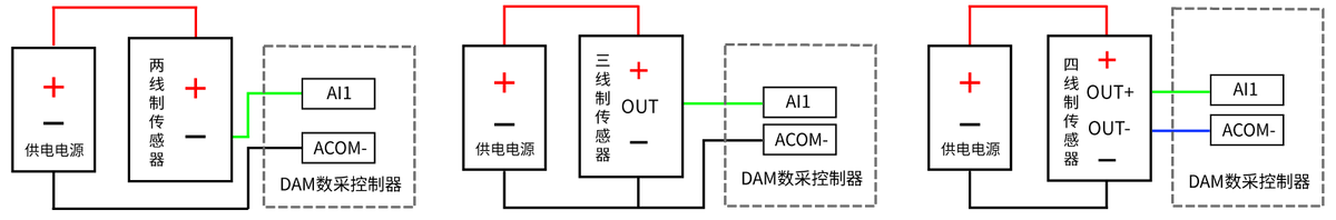 下图中的电源部分为传感器供电,AI1-AI8接传感器信号正,ACOM-为传感器信号负,ACOM+不用。