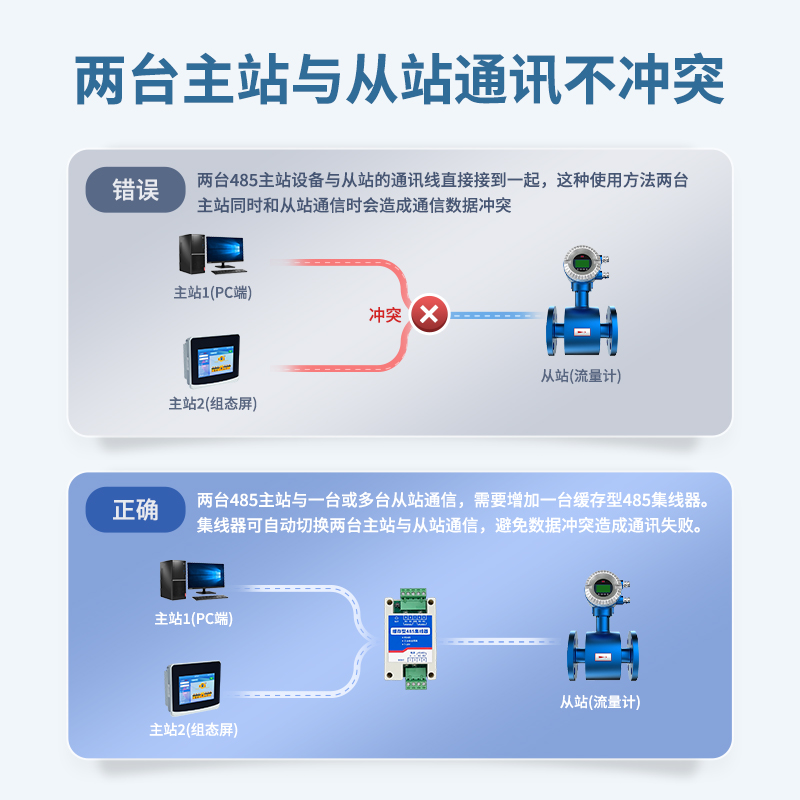 缓存型RS485集线器,两台主站与从站通讯不冲突,解决两台主机和一台或多台从机通信时导致数据冲突,两台485主站与一台或多台从站通信,需要增加一台缓存型485集线器。集线器可自动切换两台主站与从站通信,避免数据冲突造成通讯失败。