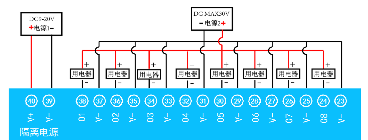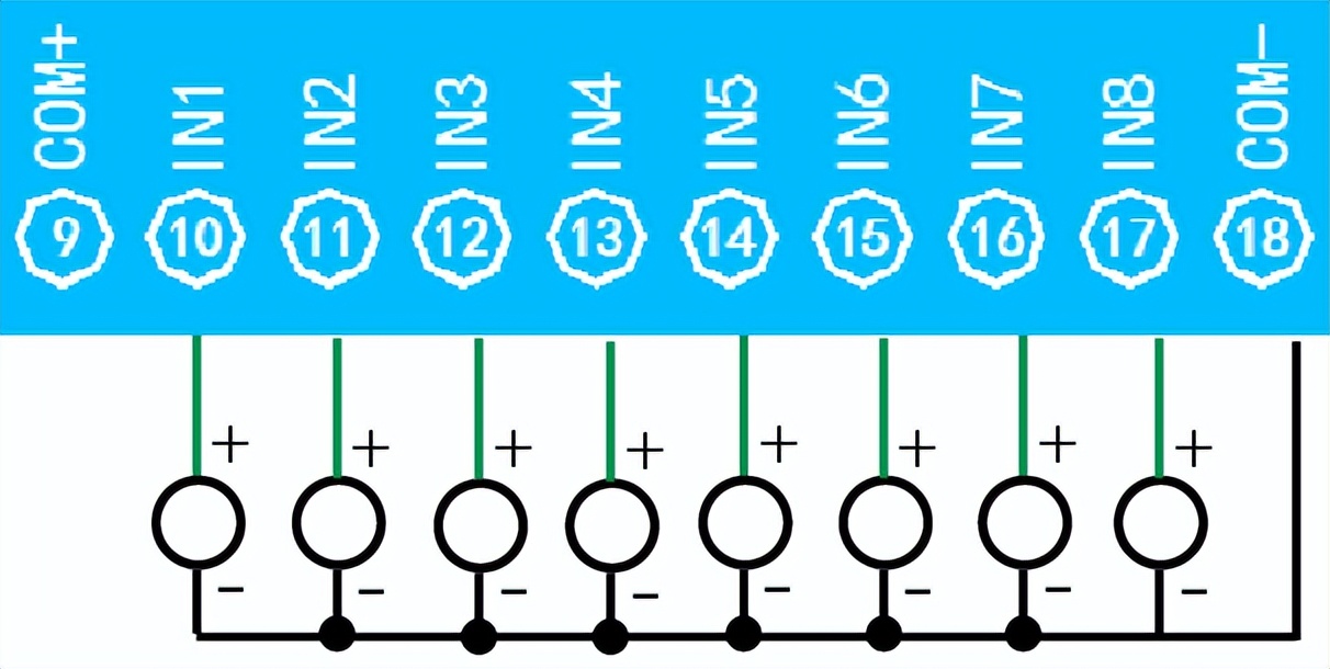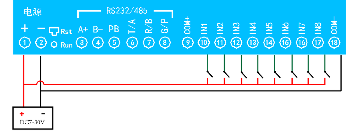 • 九路光耦隔离输入,可以接无源触点和DC5-24V电压。