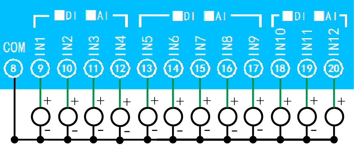 下图中的ACOM为设备上的供电负极,AINn为设备上的IN输入