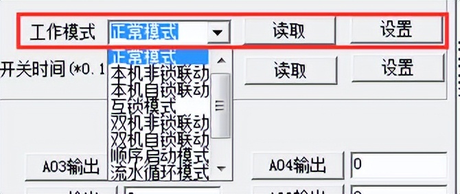 打开“聚英翱翔DAM调试软件”点击继电器模式后面下拉箭头进行模式的选择。(后边时间可自行设置,实际时间=填写数字*0.1【单位秒】)