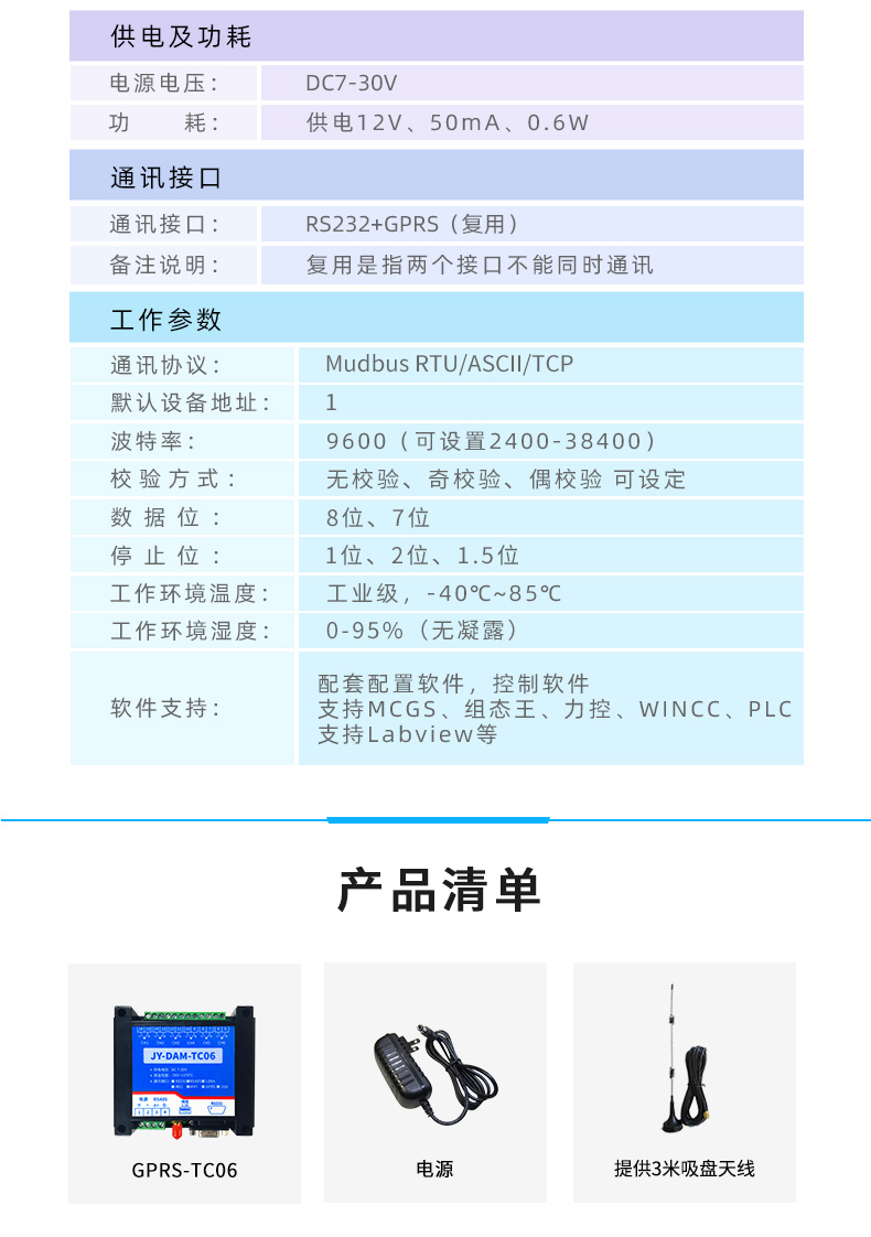 联网方式:2G/4G全网通 功能说明:6TC 版本说明:标准版 协议:Modbus TCP/RTU/ASCII 软件说明:免费测试/应用软件 二次开发:支持 安装方式:35mm导轨或四角螺丝