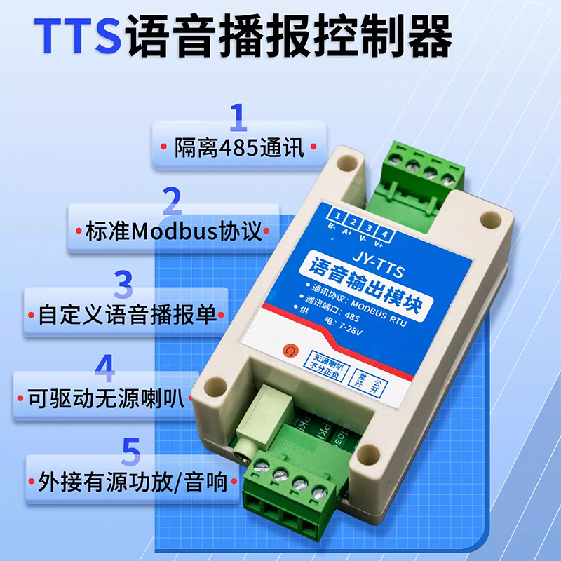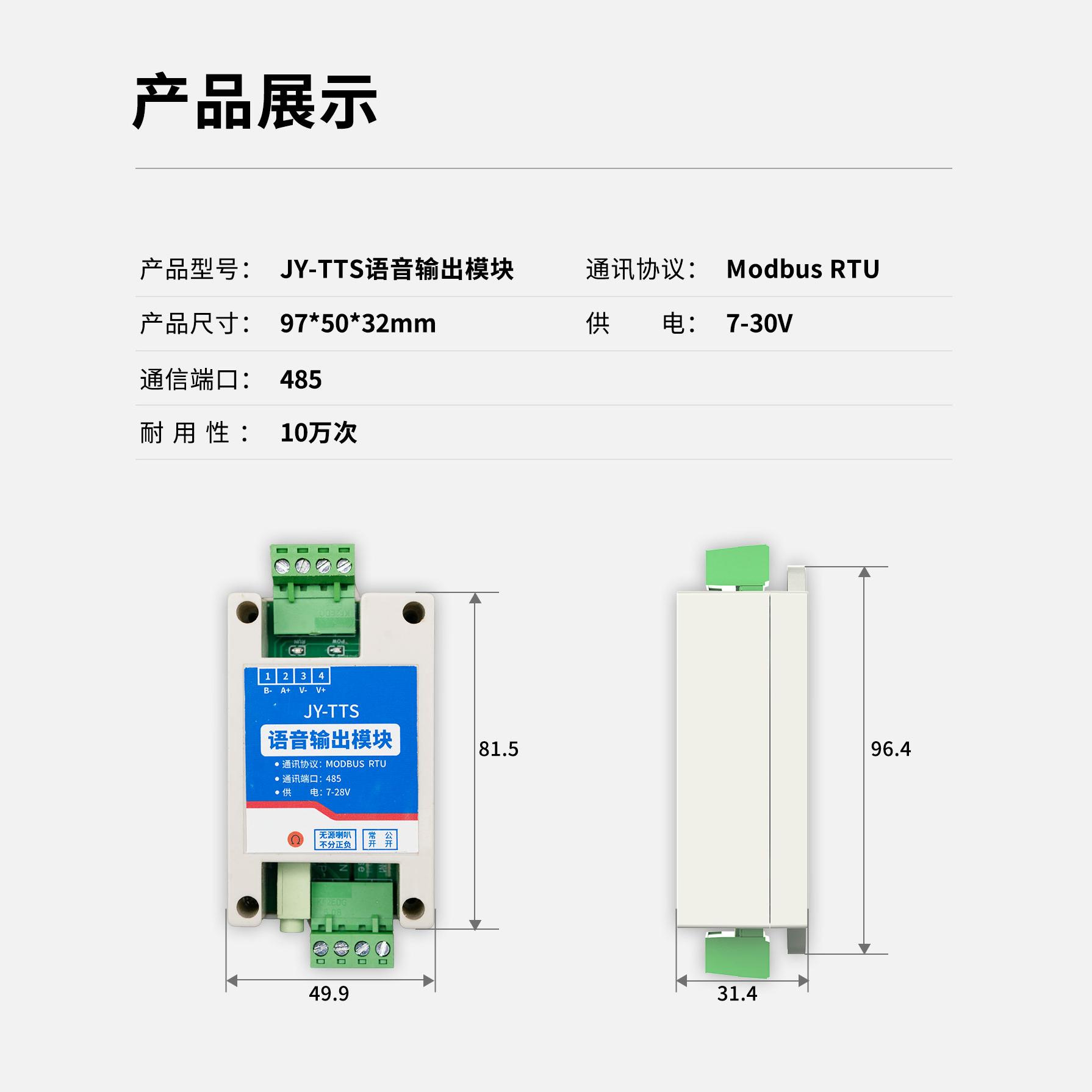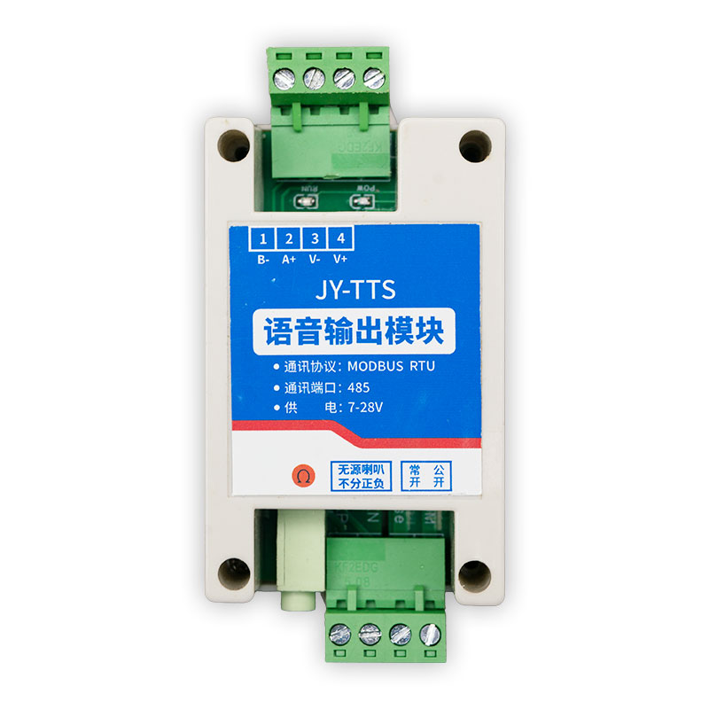 JY485-TTS ??槭且豢罡咝阅艿奈谋居镆艉铣赡??,集成了485 通讯接 口,遵循Modbus 通信协议,该??橹С指鲂曰渲?,包括单条语音的音量、音色及语速调整,满足多样化的应用场景需求。同时能够同时保存多条语音信息。此外, JY485-TTS ??椴捎眯槟?Do 触发机制,进一步提升了操作的便捷性和响应速度。