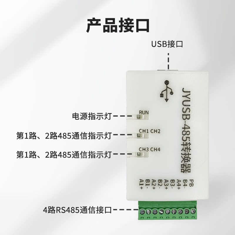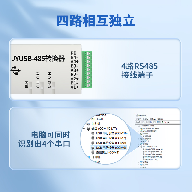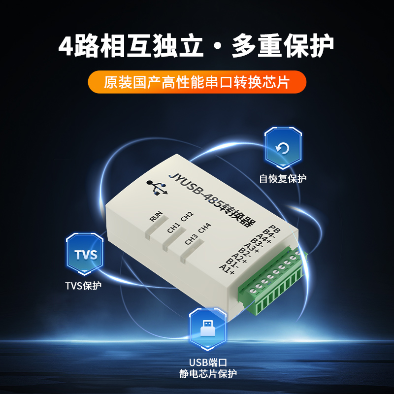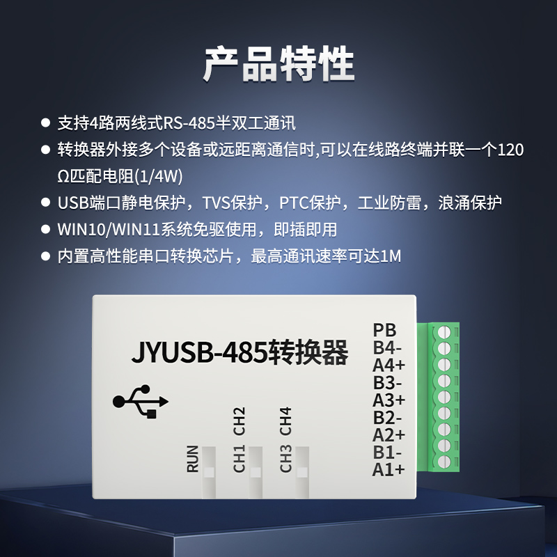 USB转RS485转换器,支持2/3/4路两线式RS-485半双工通讯转换器,外接多个设备或远距离通信时,可以在线路终端并联一个120Q匹配电阻(1/4W),WIN10/WIN11系统免驱使用,即插即用,内置高性能串口转换芯片,最高通讯速率可达1M